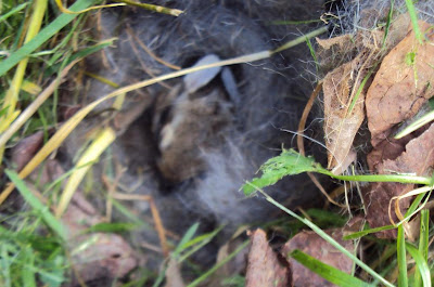 Guess what my husband found in the backyard in the grass...So adorable,five little bunnies in a little fur made nest.I couldn't get a pic of all five,just a quick pic of the inside,because my husband wanted to make sure he hadn't stepped on them before he knew they were even there.They're fine and you can see them jumping like jumping beans under the fur nest,so cute.Maybe when they're a little older I can take some pics.Right now we don't want the mother to become frightened and not come back to take care of them.He put more things around the top to give more cover for them.Later the mother came and we could see her eye peeking out of the brush at us.LOL